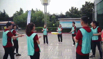 在“同心击鼓”活动中,各队选手以球心对鼓心为方向,每人牵拉一根鼓上的绳子,同心协力将鼓腾空,击鼓颠球。他们团结一致、配合娴熟。