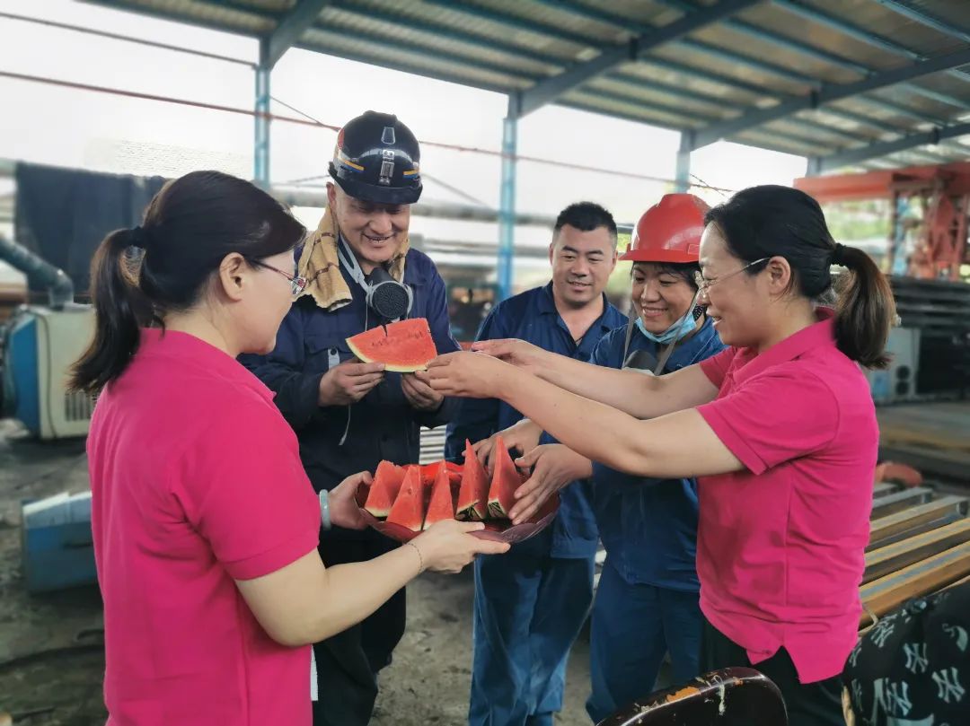 巾帼志愿者们一边为工人师傅们送上清凉可口的西瓜,对大家顶烈日、战酷暑的精神致以崇高敬意,一边叮嘱他们在高温天气作业时注意做好防暑降温措施,最大限度减少夏季高温给生产生活带来的不利影响,保护职工身体健康。