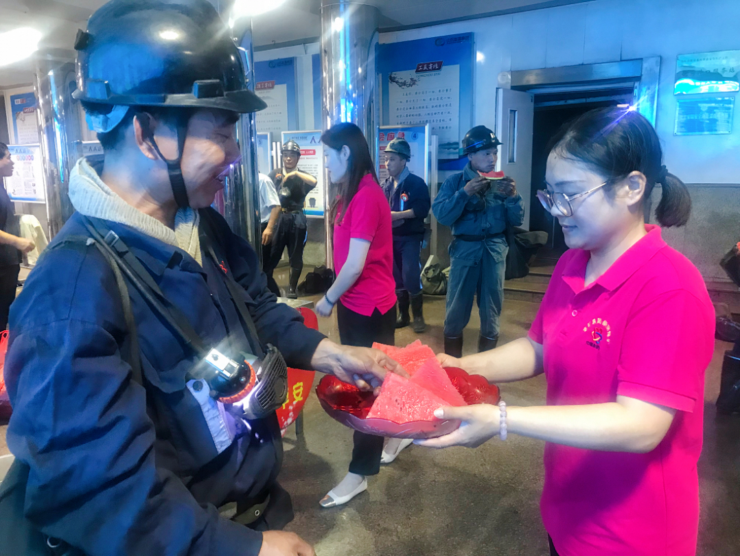 随着井口传来热情的吆喝声,已准备多时的巾帼志愿者,把切好的西瓜逐一送到刚上井的一线职工手里。