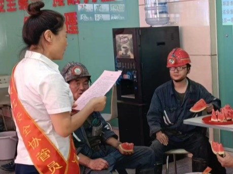 “认真抓好安全生产各项措施的落实,切实提高安全生产管理水平,坚决实现全年安全生产目标。”在井口,协管员正为采掘一线职工宣讲会议精神,发放宣传单的同时送上清甜解暑的西瓜。