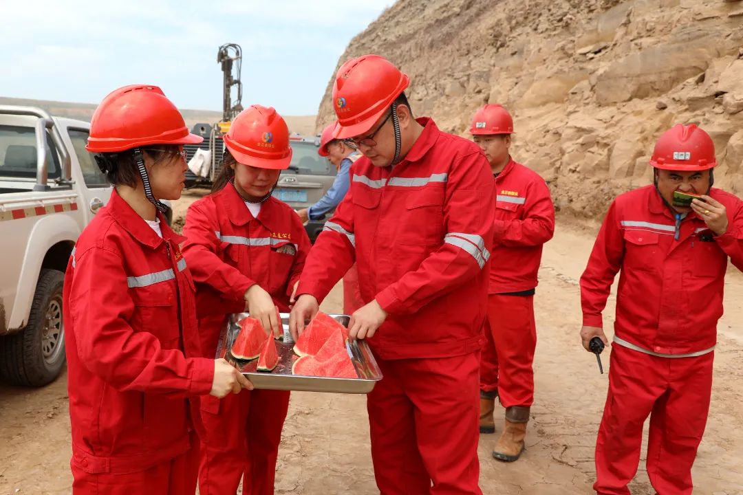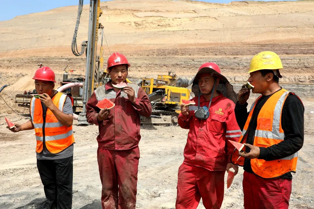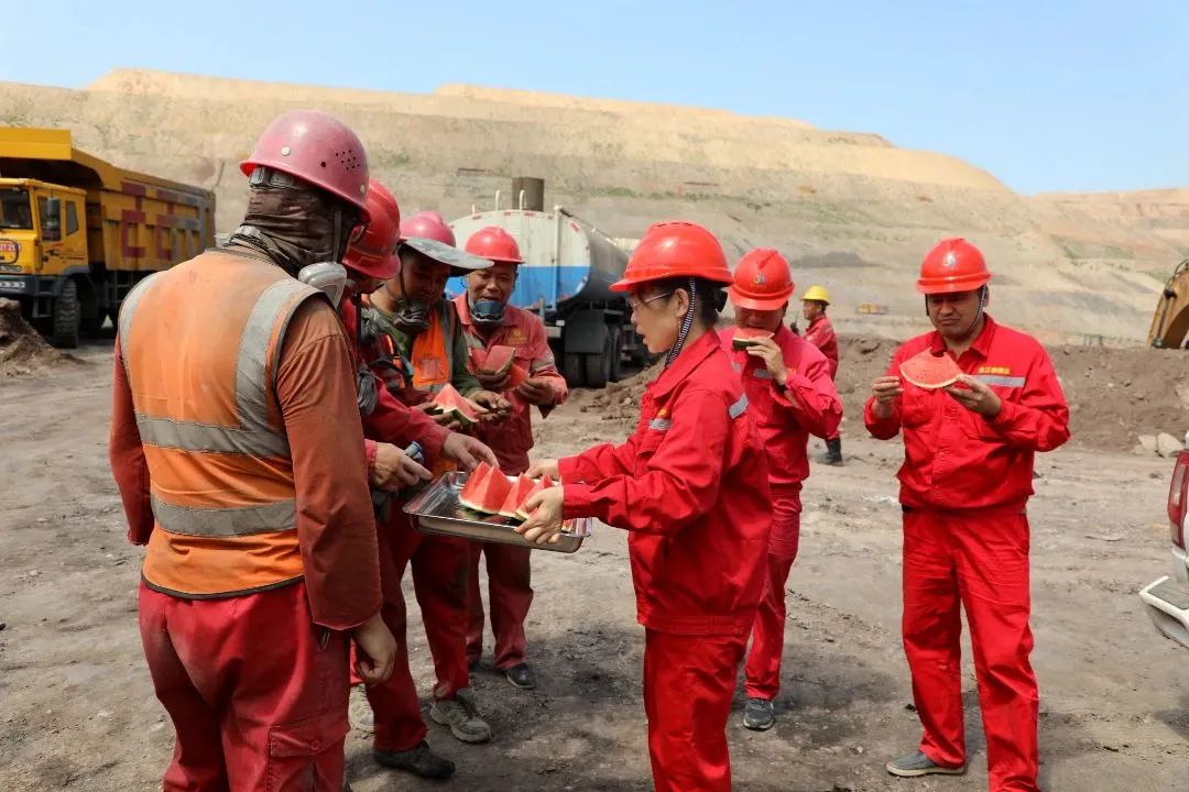 “师傅,辛苦了,赶快吃块西瓜凉快凉....”,在北边帮边坡防护工作点,女工协管员把切好的西瓜送到现场作业人员的手中,并叮嘱作业人员要落实好防暑降温各项措施,合理安排作业时间,在保证工作质量同时,也要确保人身健康。