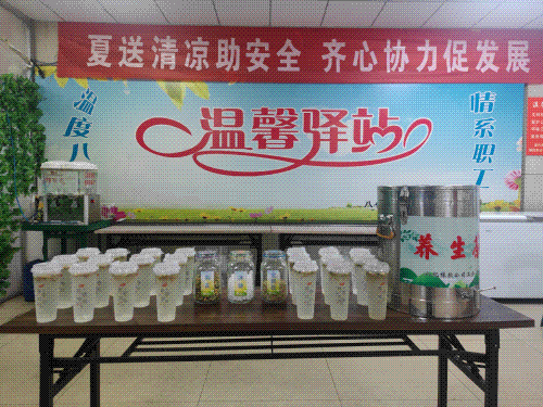 在温馨驿站里,协管员们仔细地把菊花茶、金银花茶、冰糖等一系列的饮品用热水泡好,并热情地把饮品递到一线职工的手里。“师傅,天气太热了,干活可要注意防暑降温!”“师傅,喝了这杯解暑茶再工作吧!”一句句温暖的话语,一声声亲切的叮嘱,传递着公司对职工安全生产的关心。一杯菊花茶送到职工手里,职工喝着菊花茶,纷纷表示“喝在嘴里,甜在心里,一定严格标准流程,上标准岗、干标准活,确保安全生产”。