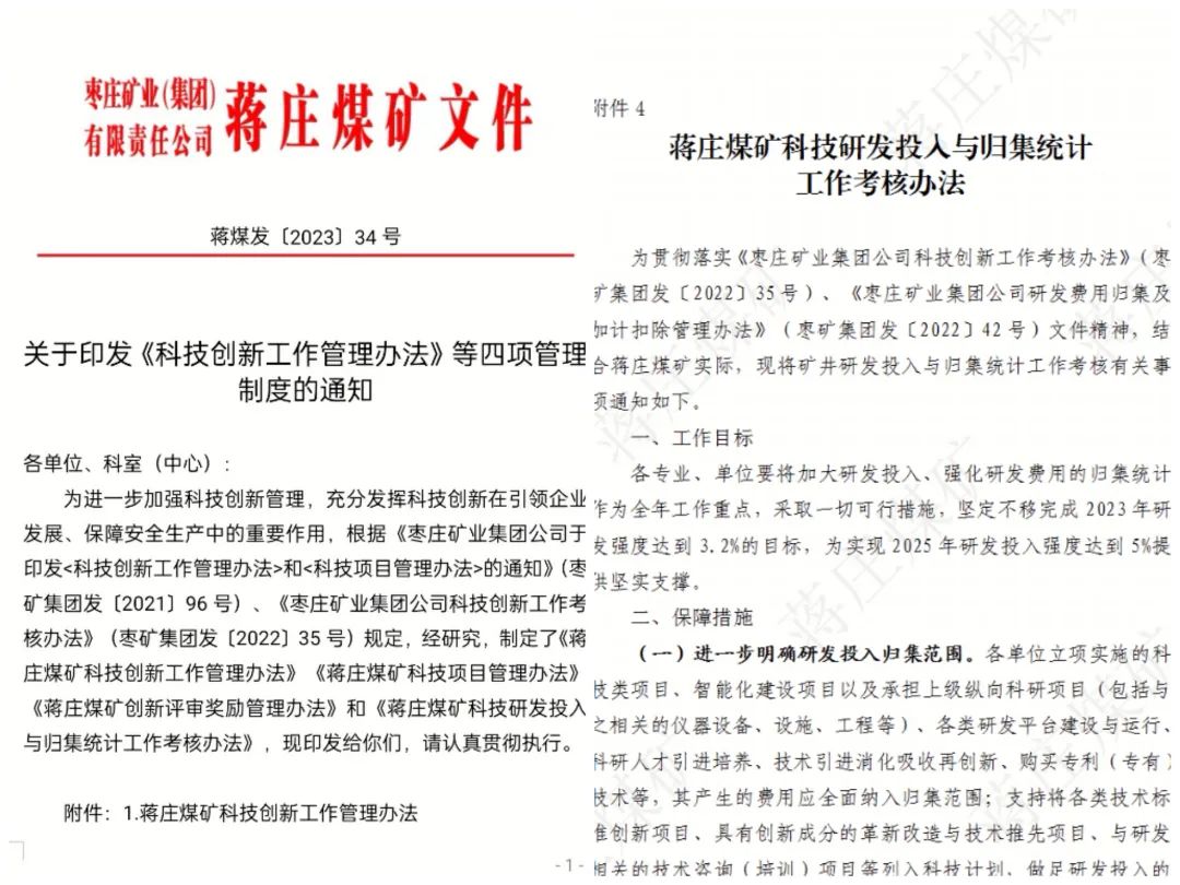 该矿还制定了《蒋庄煤矿“双创”工作实施意见》和《蒋庄煤矿创新项目研发费用归集政策创效管理办法》,鼓励全员参与小改、小革、合理化建议、科技创新。构建了矿长、党委书记人才使用、资金投入保障体系,总工程师科技创新、科技攻关、技术改造推进体系。重磅“加码”奖励创新人才和成果,充分调动起全员创新创效的积极性,使矿井始终保持澎湃的创新动力。