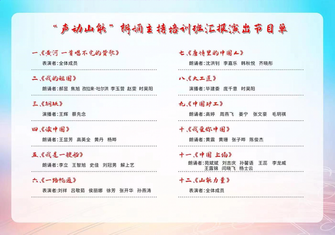 8月20日上午,伴随着一首首激昂奋进的乐曲、一部部充满家国情怀的诗作,山东能源集团“声动山能”朗诵主持培训班汇报演出圆满成功,标志着由能源集团工会主办,枣矿集团工会、山能培训枣矿校区联合承办,为期8天的“声动山能”朗诵主持培训班划上了圆满的句号。