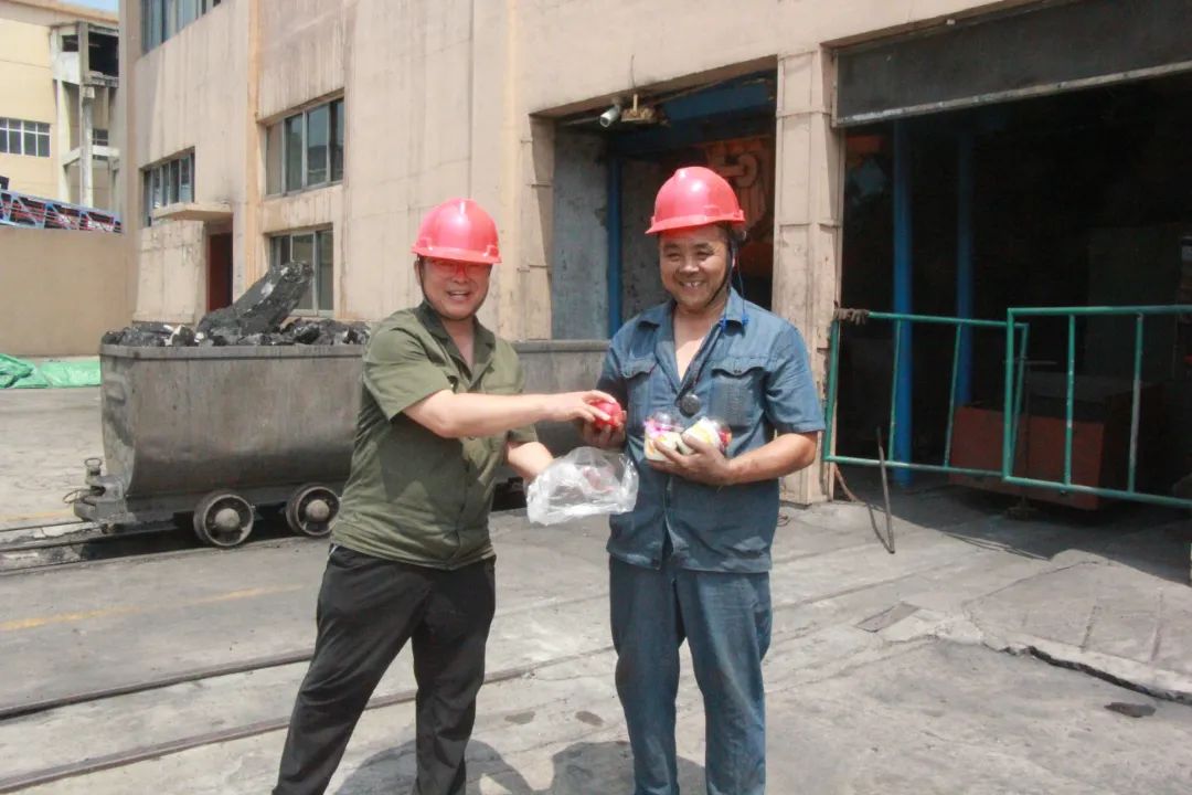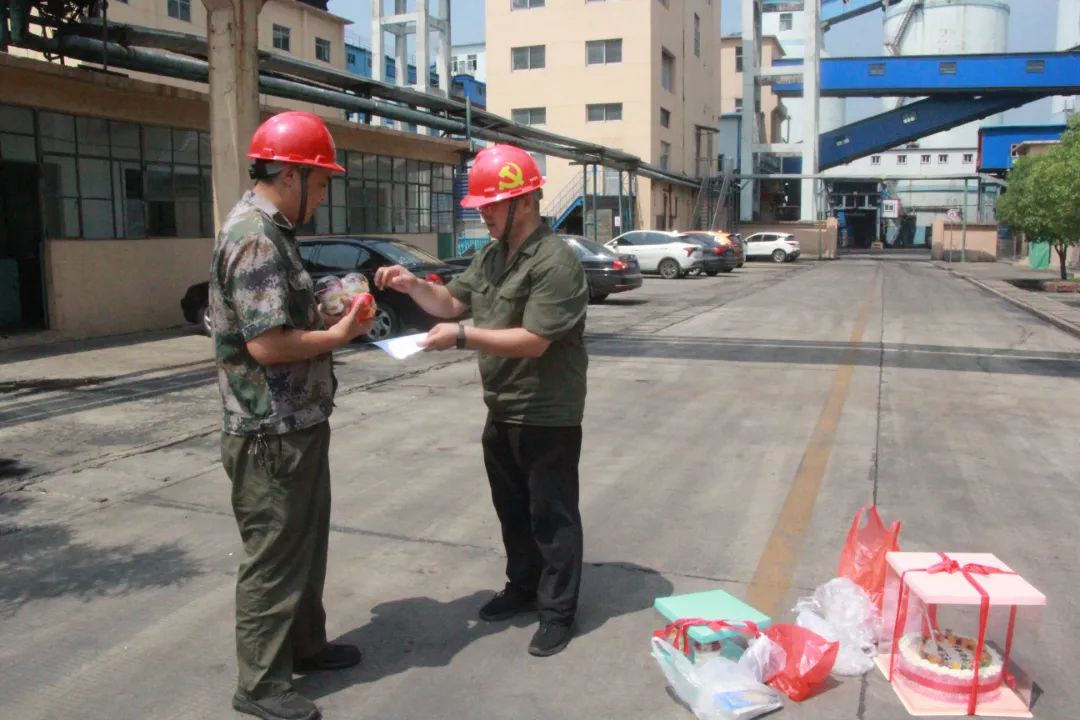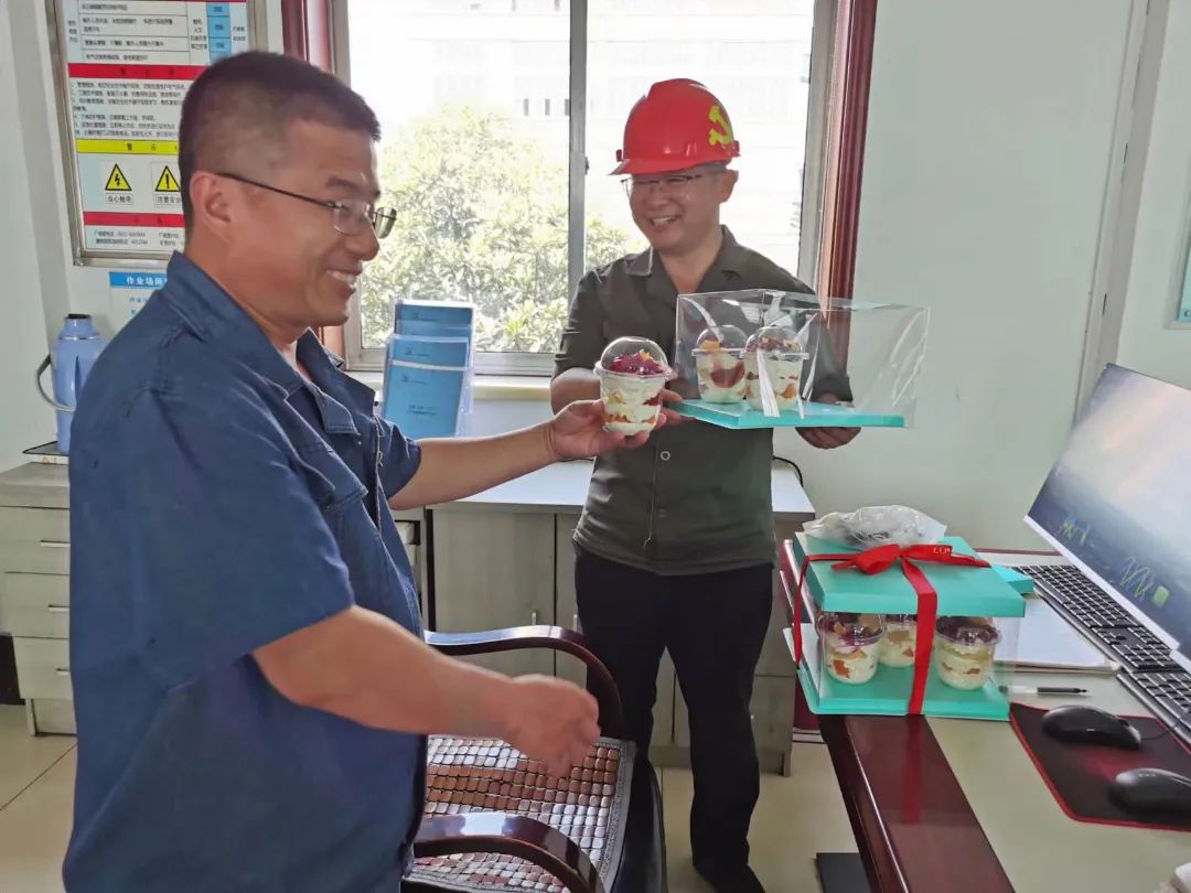 上午十一点,生产赶过一个循环,车间工会主席和群监员、协管员一起,冒着炎炎烈日将提前准备好的生日蛋糕、“寿桃”,逐一送到该厂智能调度台、精煤地销装车站场、原煤主厂房、重介密控室等边远重要岗点员工的手中,并致以生日的问候和祝福,同时鼓励大家面对当前煤炭严峻形势和困难,牢固树立“一家人、一条心、一盘棋”意识,勇于担当、承压奋进,不断为企业更高质量、更可持续发展再立新功。