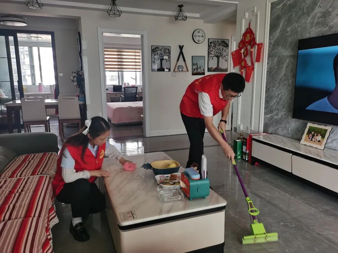 “老人家,我们给您打扫打扫卫生!”两名志愿者走上前,亲切地询问老人的近况,和老人唠着家常,其他志愿者拿着水桶、抹布、清洁剂准备对客厅、厨房和卫生间进行清洁。大家分好工,挽起袖子开始打扫,不一会儿,餐桌、地板被擦拭得焕然一新,房间收拾得整整齐齐。