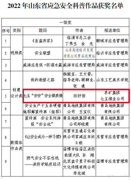 近日,山东省人民政府安委办、省应急厅印发了《关于2022年山东省应急安全科普作品征集评选结果的通报》,山东能源枣矿集团七五煤业公司选送的作品《七五“安安”安全微表情》荣获创意设计类一等奖。