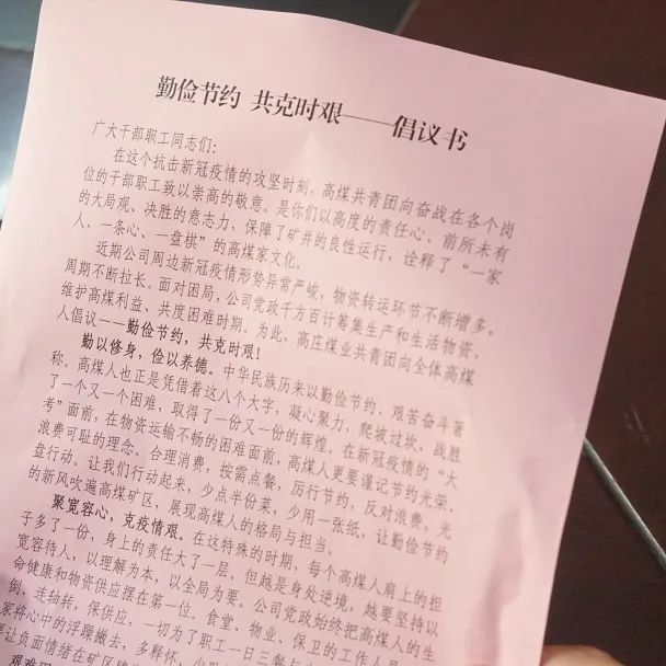 高庄煤业共青团号召公司全体干部职工在疫情防控的关键时刻,要从思想上牢固树立尊重劳动、节俭兴矿的意识,大力发扬艰苦奋斗精神,积极弘扬中华民族优秀传统美德,全力配合公司落实好疫情防控的举措要求,厉行勤俭节约,杜绝餐饮浪费,为保障疫情防控期间和谐稳定、为打赢疫情防控狙击战贡献自己的力量!