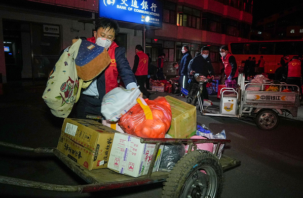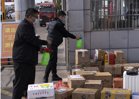 “大家不要着急,将物资给我就可以了。我们志愿者会完成消杀和搬运,包裹很快就回到你们亲人手中”,在高晟工业园区,“小年高”志愿者李浩田正在接收包裹。