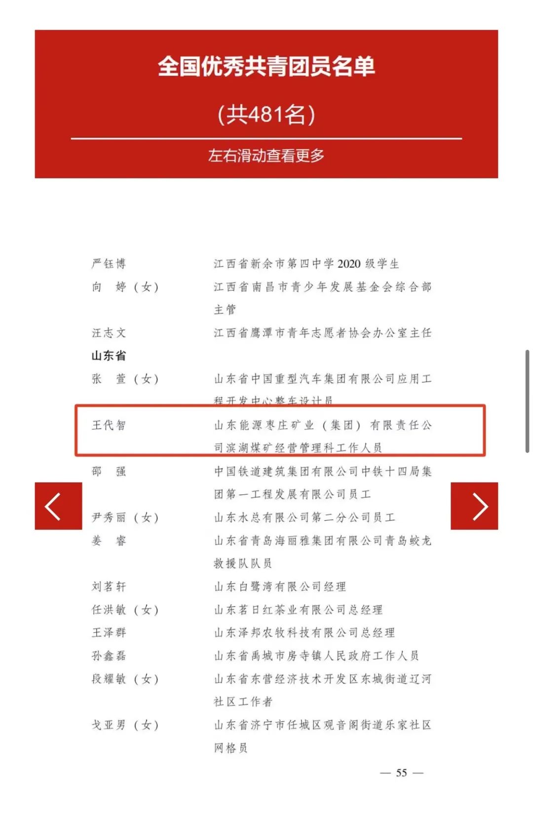 4月20日,共青团中央作出表彰决定,授予296个团组织全国五四红旗团委称号;授予389个团组织全国五四红旗团支部称号;授予481名同志(含追授1名)全国优秀共青团员称号;授予342名同志全国优秀共青团干部称号。山东能源枣矿集团滨湖煤矿青年王代智荣获“全国优秀共青团员”荣誉称号。