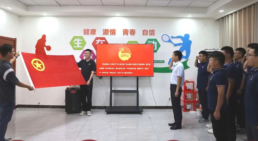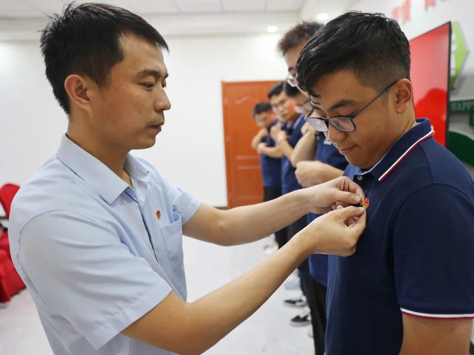 “我志愿加入中国共产主义青年团,坚决拥护中国共产党的领导……”活动现场,该公司团委负责人为9名新入职的共青团员佩戴团徽,并带领他们面向团旗庄严宣誓。