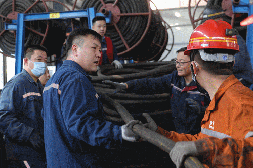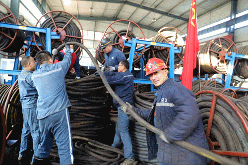在电缆存放车间,只见党员及青年志愿者们换上工装、戴上安全帽,撸起袖子加油干。他们每隔1米依次排开,喊着统一的号子,扛起宛如长龙的电缆一米一米地将电缆拉向指定位置。