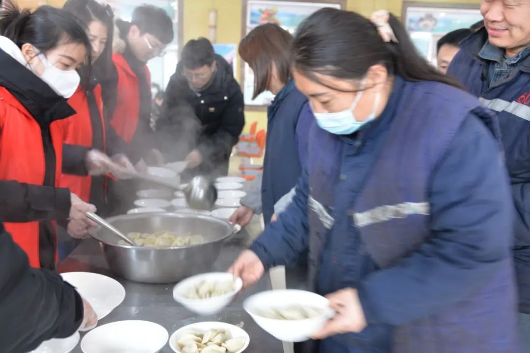 为了让职工们感受到家的温暖,吃上一碗象征平安、团圆的饺子,志愿者们一大早就来到职工餐厅做准备,调馅、和面、搓条、擀皮、包饺子,大家分工合作,将爱心化作行动,把祝福包进水饺。