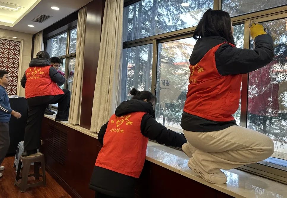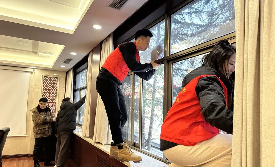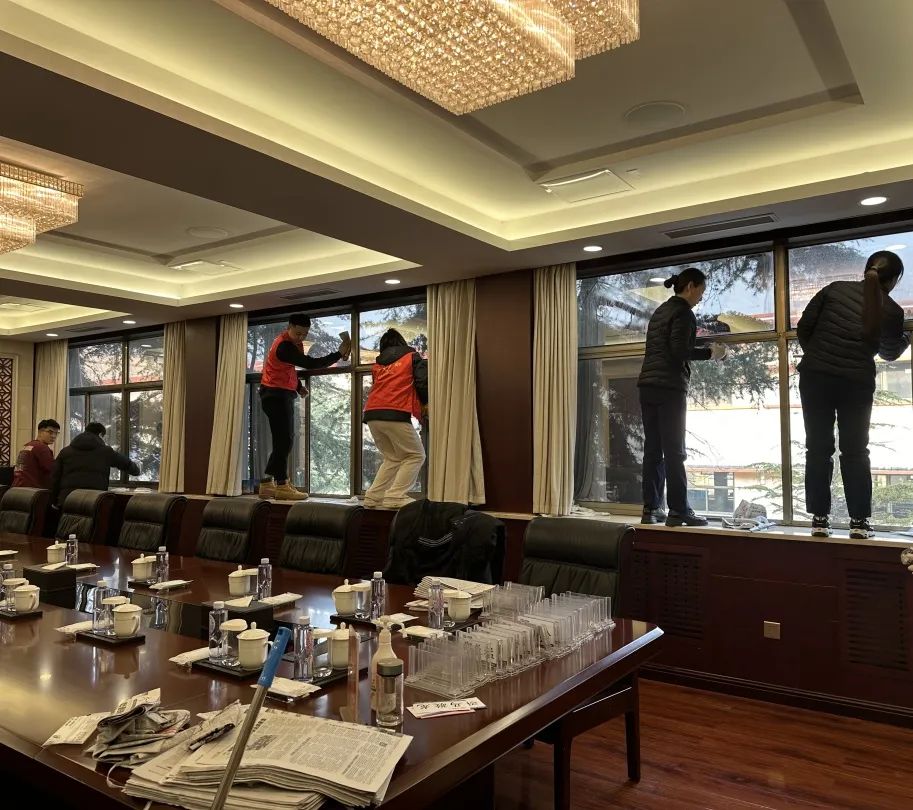活动中,青年志愿者积极踊跃、分工协作,对办公楼各会议室进行全面清扫。