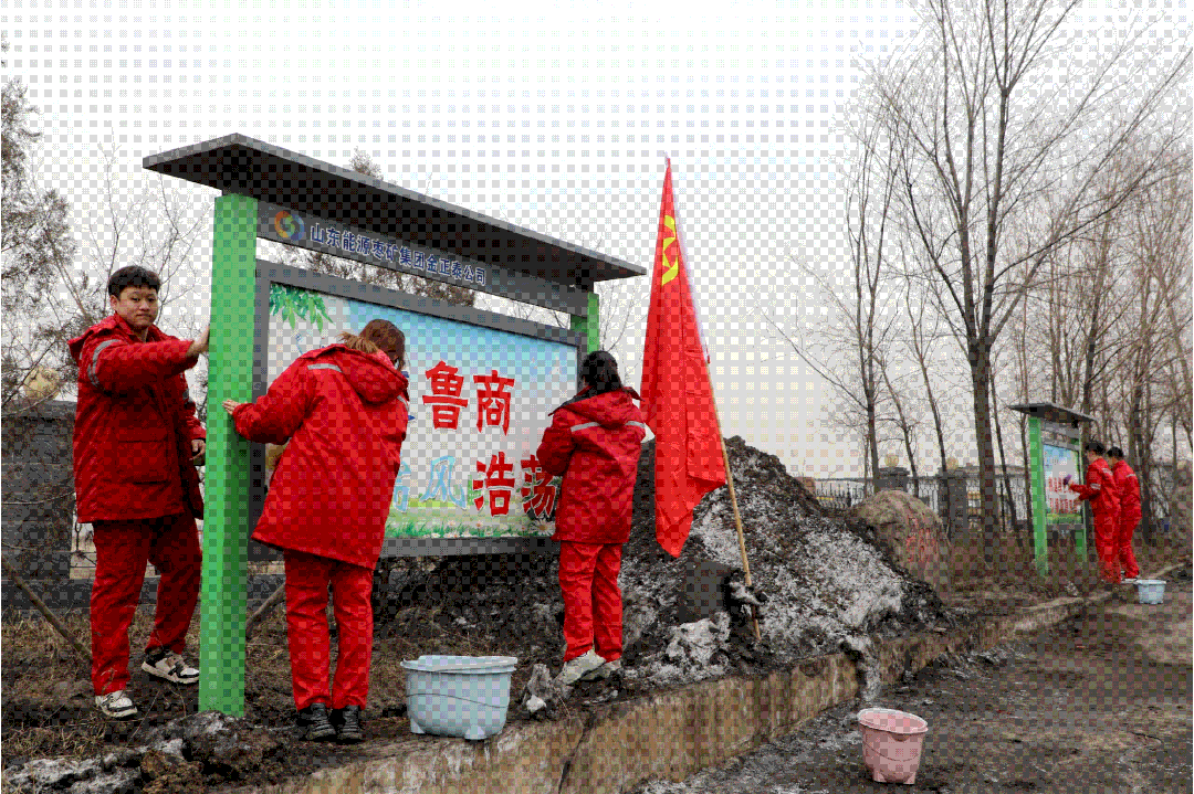 在金正泰公司运煤道路上,鲜艳的团旗随风飘扬。十余名青年志愿者拎着水桶,带着抹布,爬上路边护坡,逐一清理着路边宣传橱窗。