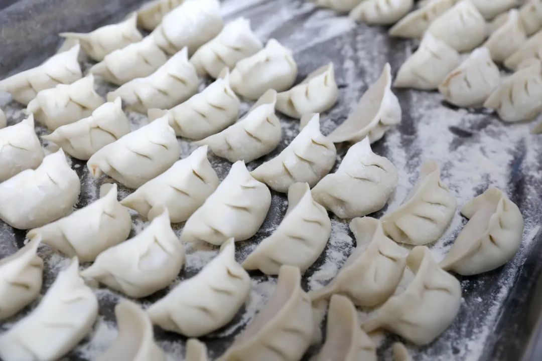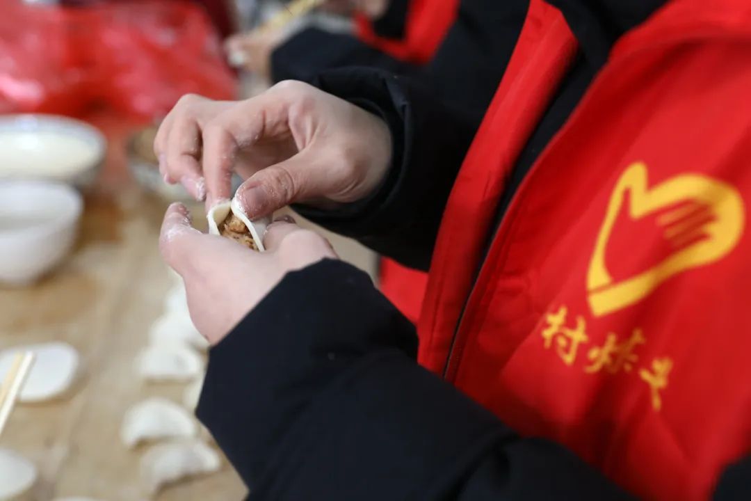 在敬老院大厅,几张摆满了包饺子所需原料、餐盘等工具的餐桌拼在一起,这便是即将开展的包饺子的活动“主阵地”。大家分工合作,有的擀皮,有的包馅,每一个饺子都充满了对老人的关怀。