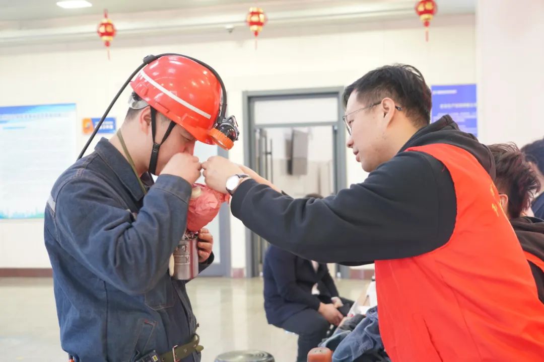 青年志愿者在井口开展“正确佩戴使用自救器”安全宣教,对隔绝式化学氧气自救器的构造、原理、日常维护、正确佩戴方式及注意事项进行讲解示范,为矿井安全生产增加砝码。