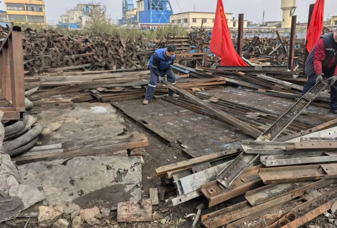 针对难题,突击队员按“区域划分、责任到人”原则,分三个作业区协同攻坚:南区队员归位皮带机相关配件,码放“H”架50余件、上托辊架近80件;中区队员精细化分拣200余件槽钢,按规格和完好度分类;西区队员从废料中筛选出方木码20余个、可复用木材3车,还规范整理30余根各类软管,累计清理废料垃圾5车。